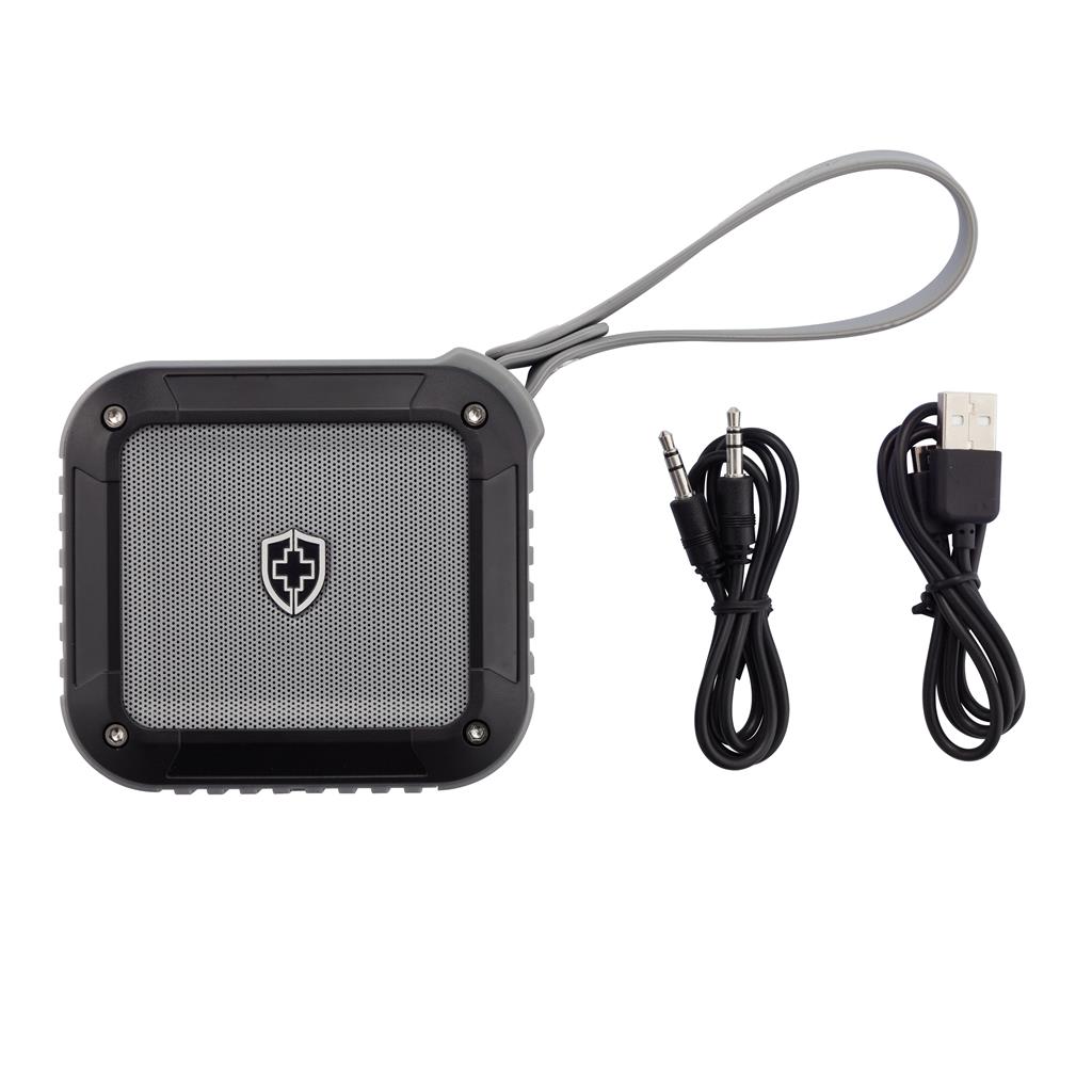 Artikelcode: GIFTS.DOM.P326.351Schok, stof en waterbestendige draadloze speaker (IPX5) met krachtige 5W speaker en oplaadbare 1500 mAh batterij die je tot 10 uur lang laat genieten van je favoriete muziek. De speaker heeft een handsfree functie voor het beantwoorden van gesprekken en kan ook gebruikt worden via de 3.5 mm audio kabel die meegeleverd wordt. Inclusief siliconen band om de speaker overal op te hangen.